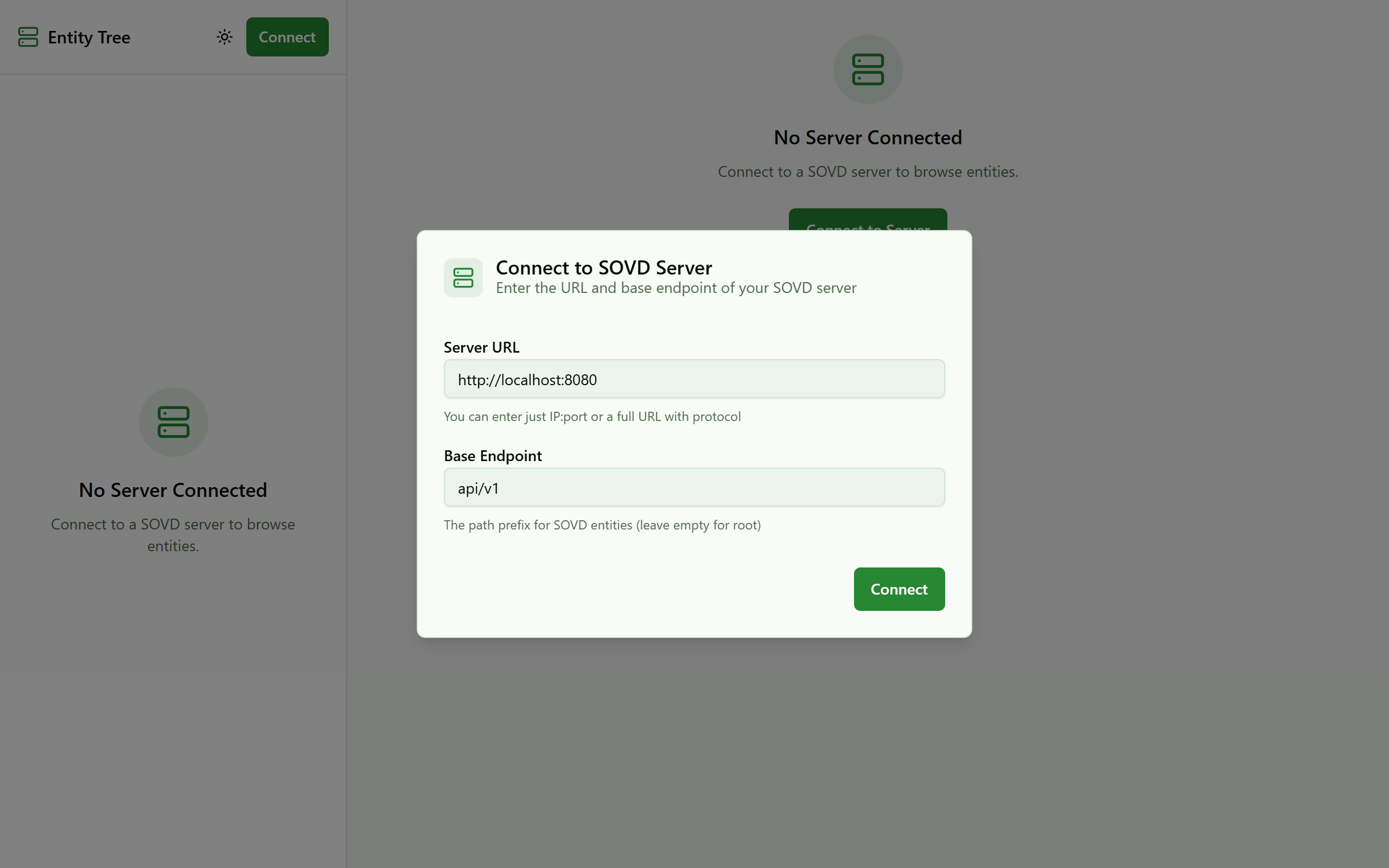 Open the web UI in your browser — you’ll see the connection dialog: