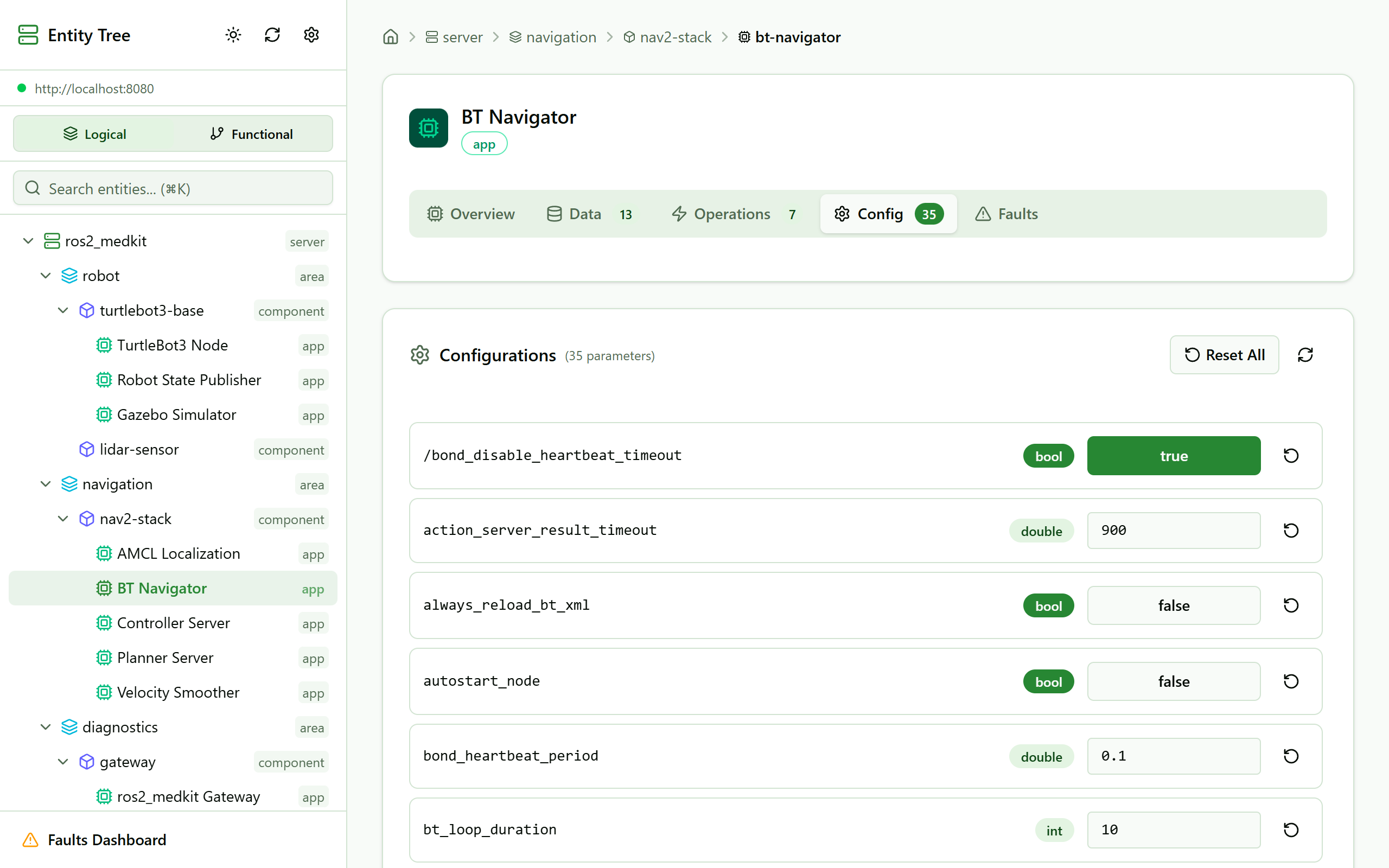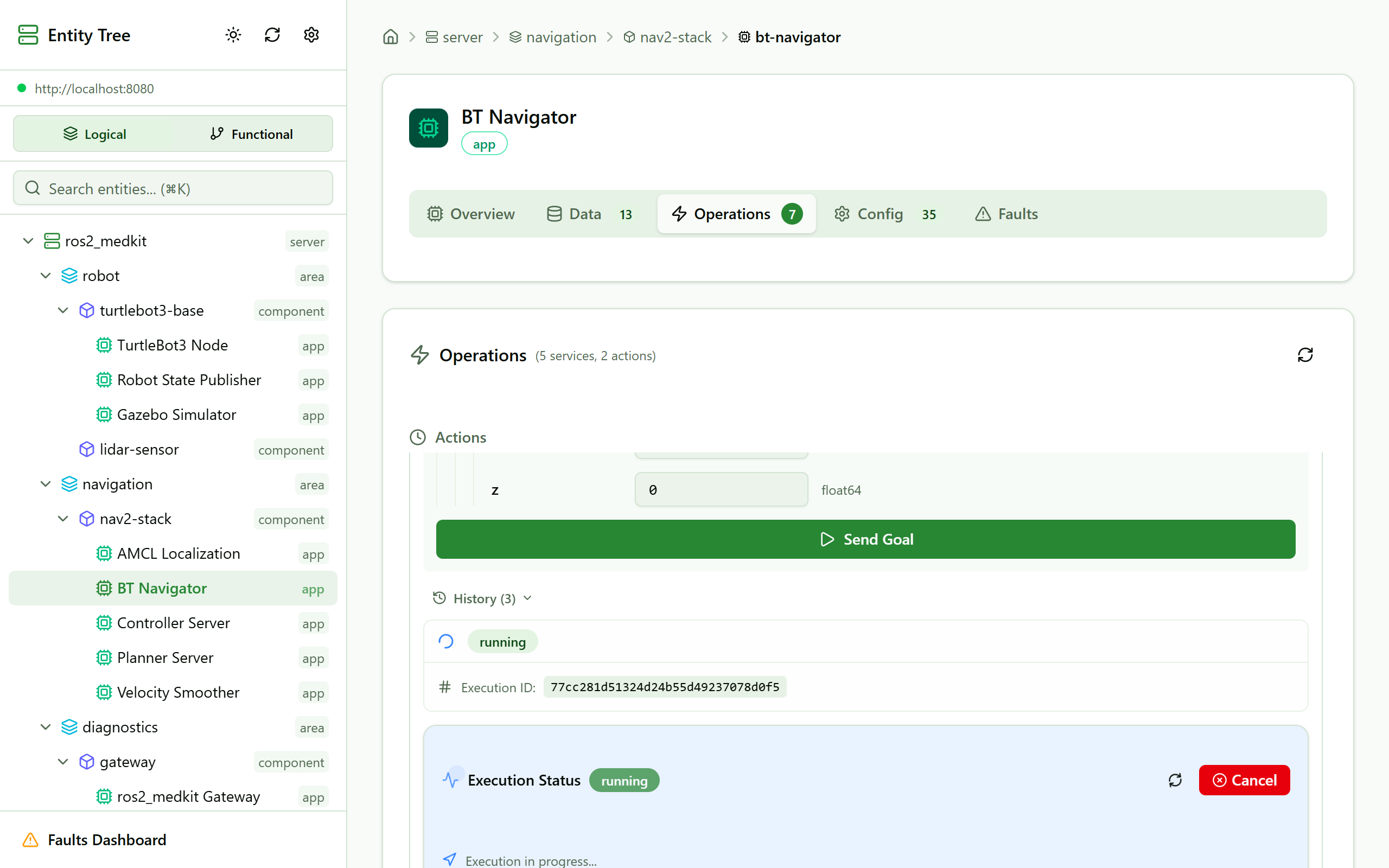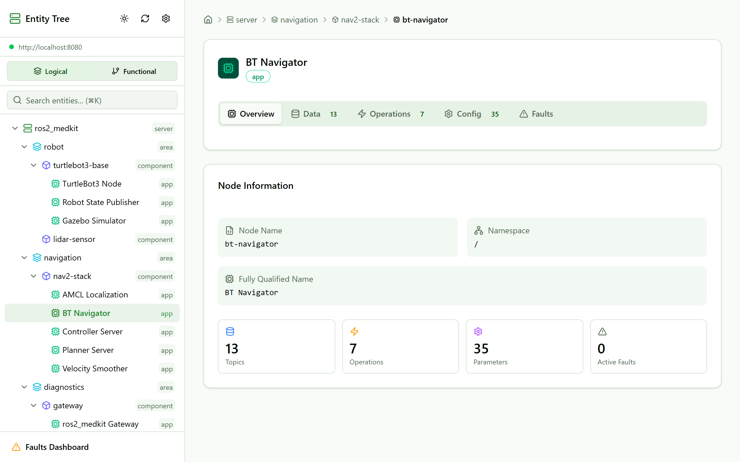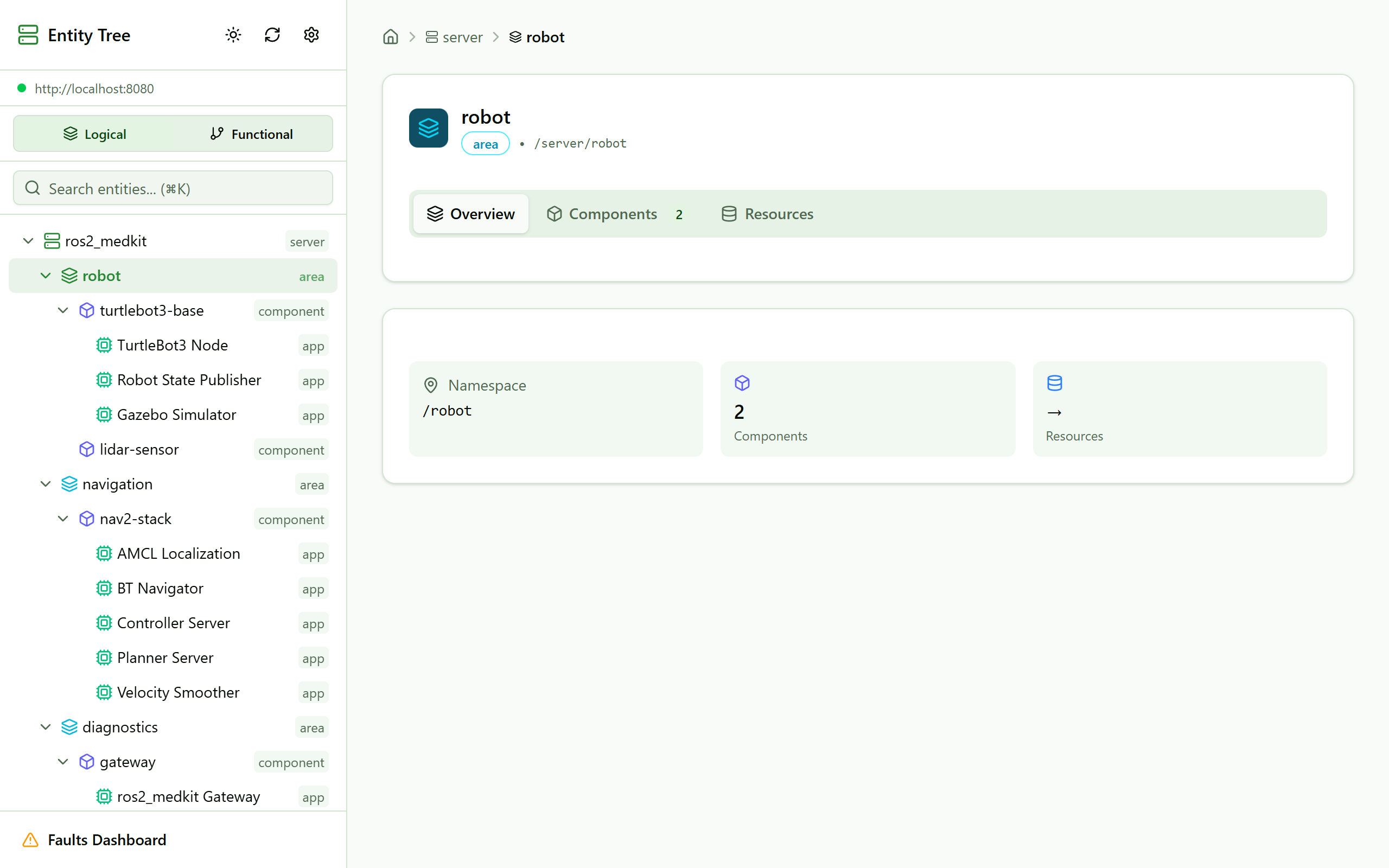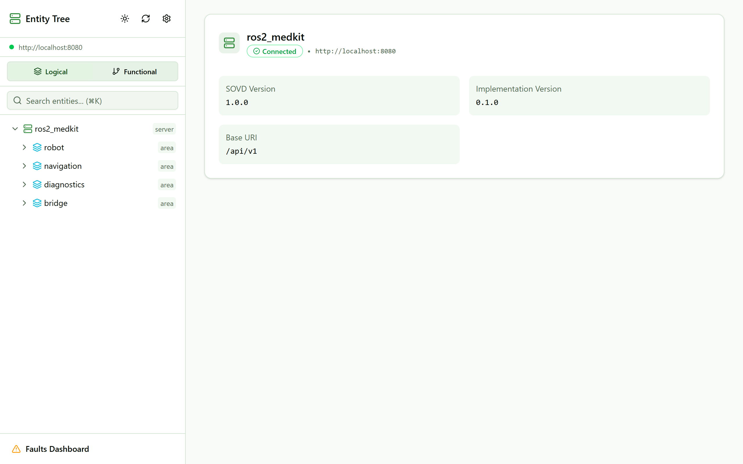 sovd_web_ui is a lightweight web application for browsing SOVD entity trees. It connects to the ros2_medkit gateway and visualizes the entity hierarchy.